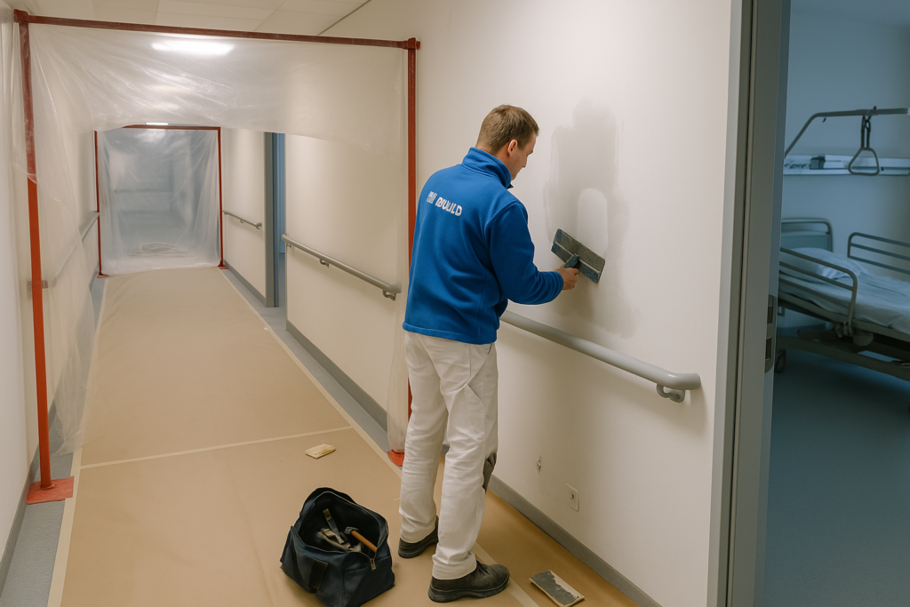 Nous accompagnons les services techniques d’hôpitaux, de cliniques, de centres de rééducation et d’unités spécialisées dans la réalisation de travaux de maintenance, de réparation ou de finition. Notre approche est structurée, discrète et centrée sur la continuité des soins.